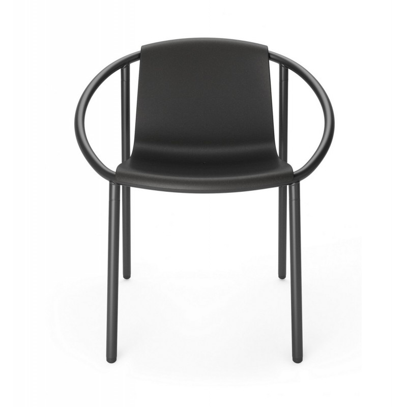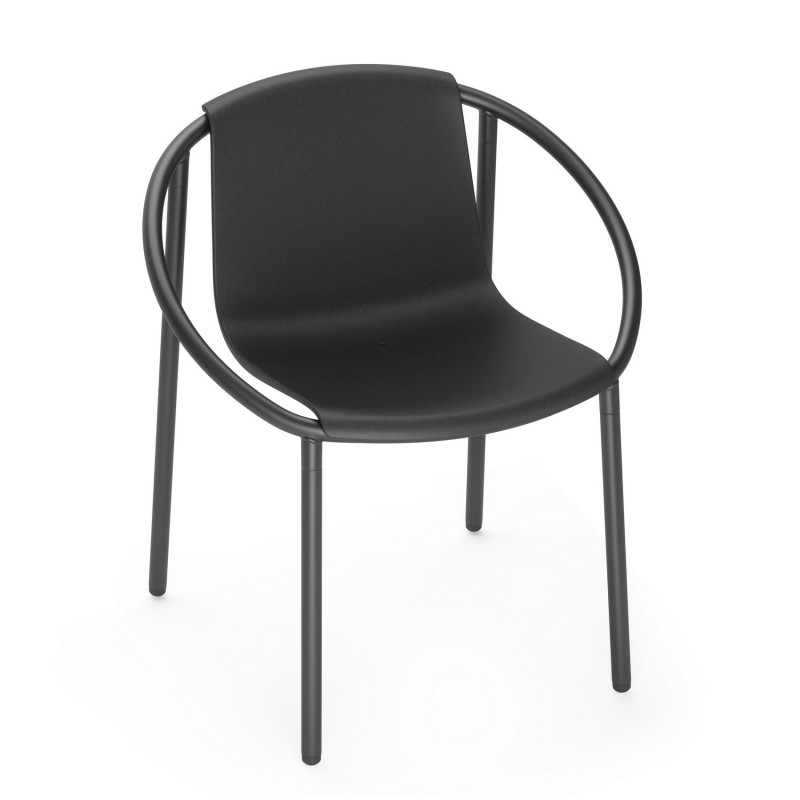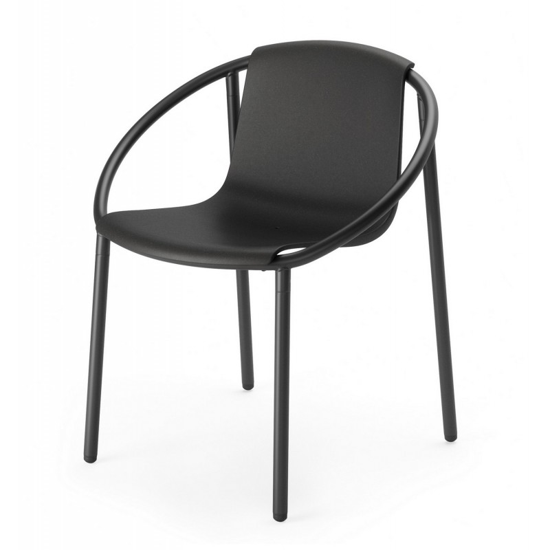 Der Ringo Umbra Designstuhl lehnt die geometrische Form des Kreisrahmens auf die glatte und organische Form des Sitzes ab; gibt den Eindruck, dass der Sitz im Kreis schwebt. Tsehr komfortabel ist Ringo aus rostfreiem Stahl und einer Mischung aus Polypropylen und Holzfaser.