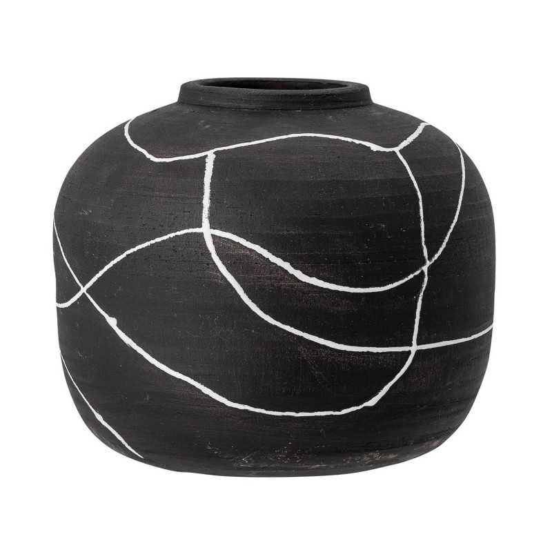 Sehr dekorative diese Vase Niza aus Bloomingville mit ihrem Kontrastmuster in schwarz und weiß. In matt schwarzer Terrakotta und mit einem glänzenden weißen Muster verziert. Jede dieser Vasen ist von Hand dekoriert und bemalt und macht jede Vase einzigartig.