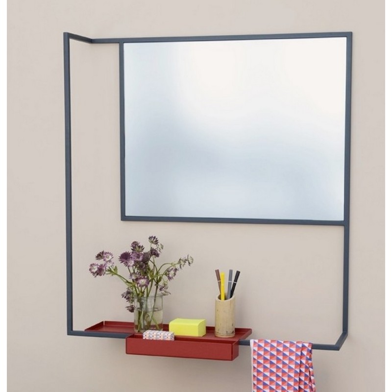 Schiefergrauer Designspiegel aus Metall und burgunderrotes Regal mit Romi-Zitronenpresse