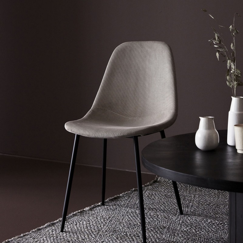 Die dünnen, dunklen Stahlbeine bringen Leichtigkeit und Eleganz zu einem sehr bequemen Stuhl aus Schaumstoff und einer Samtbeschichtung.