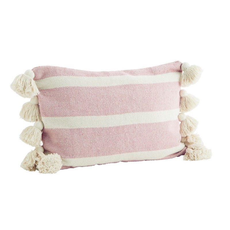 madam stoltz housse coussin rectangulaire raye blanc rose gros pompons