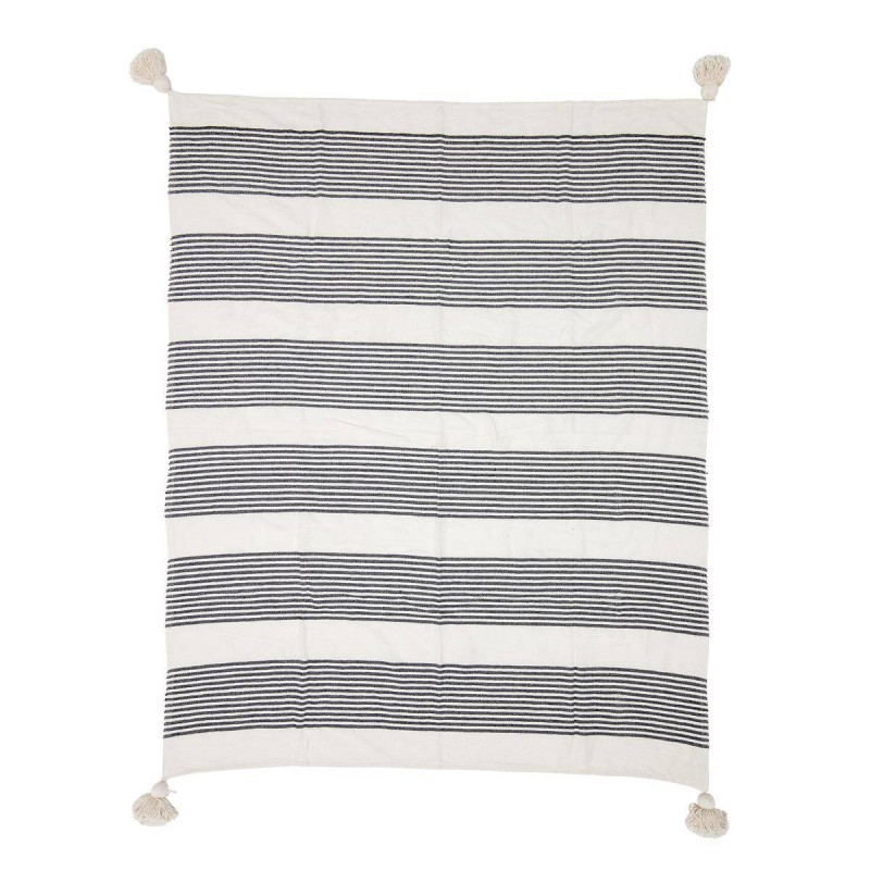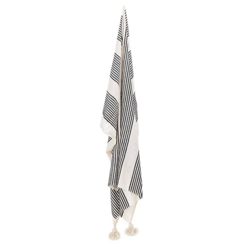 bloomingville plaid noir blanc raye pompons boran 125 x 150 cm