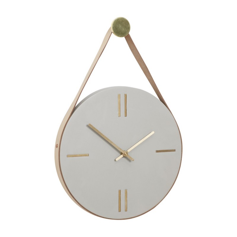 Horloge murale beton suspendue par laniere en cuir hubsch