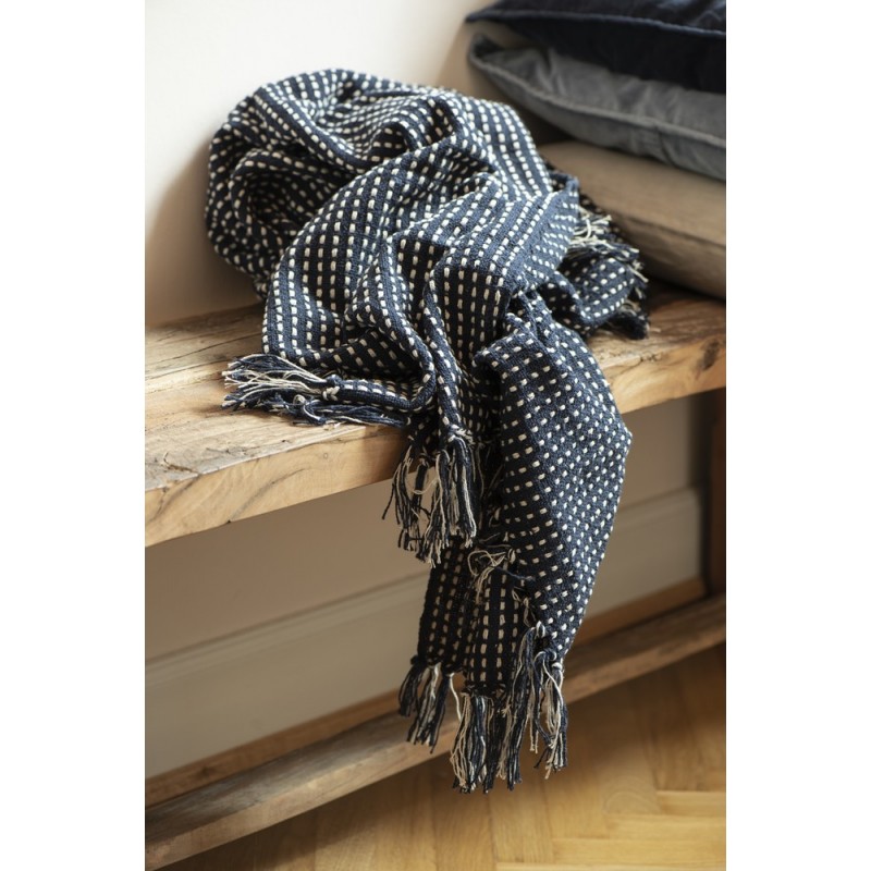 ib laursen plaid bleu fonce coton franges 130 x 160 cm