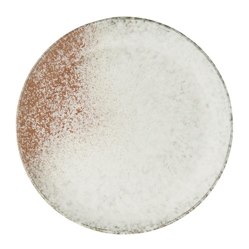Fabriquée à la main avec soin, cette assiette de couleur crème est sublimée par de délicates projections de touches de couleur orange, créant un contraste subtil et élégant.