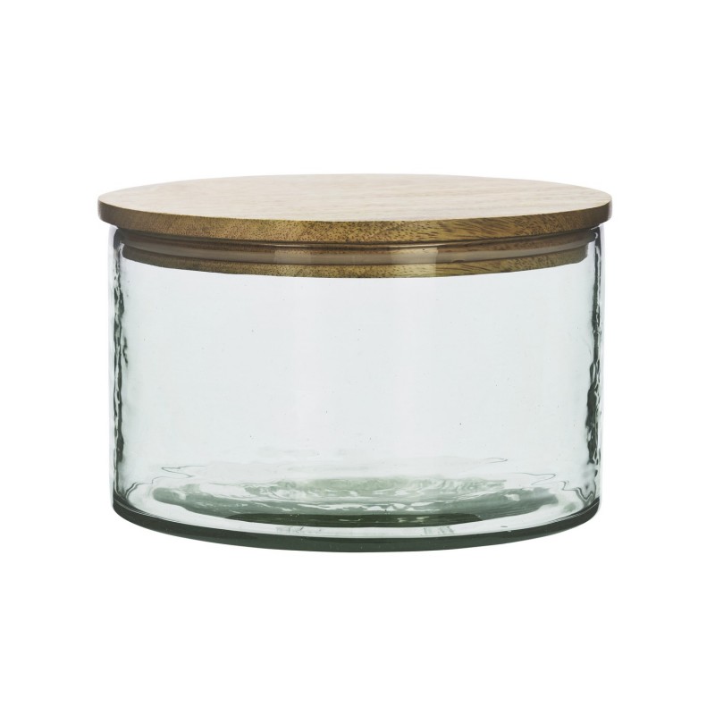 Fabriqué en verre partiellement recyclé et surmonté d’un couvercle en bois de manguier, ce bocal allie beauté brute et efficacité.