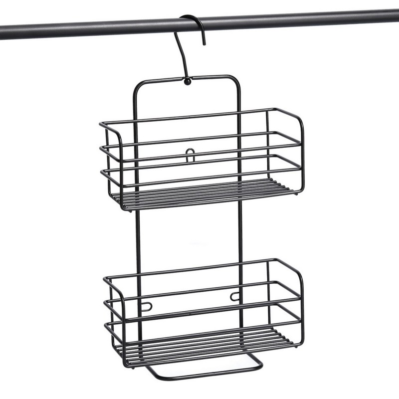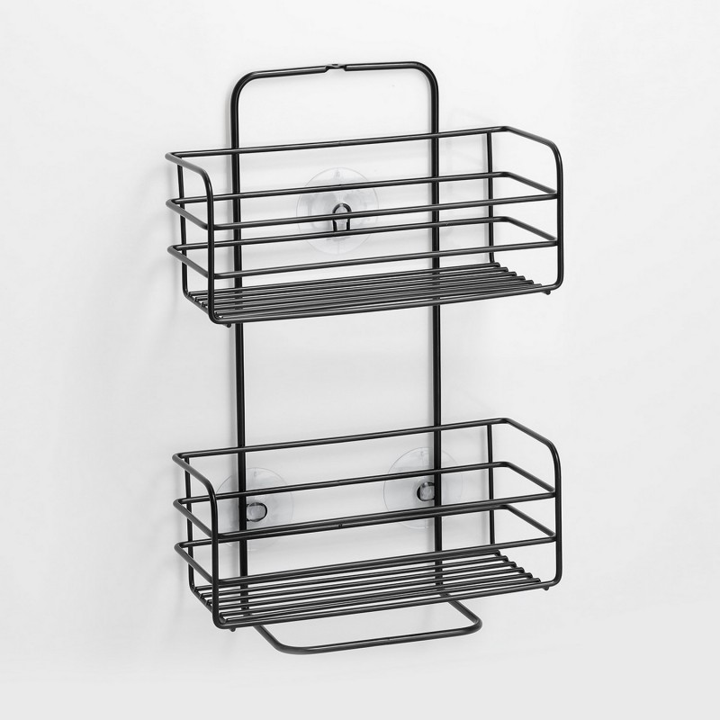 Ce modèle en métal noir est équipé de ventouses et d’un crochet, offrant une solution pratique pour organiser vos produits de soin, shampoings et gels douche.
