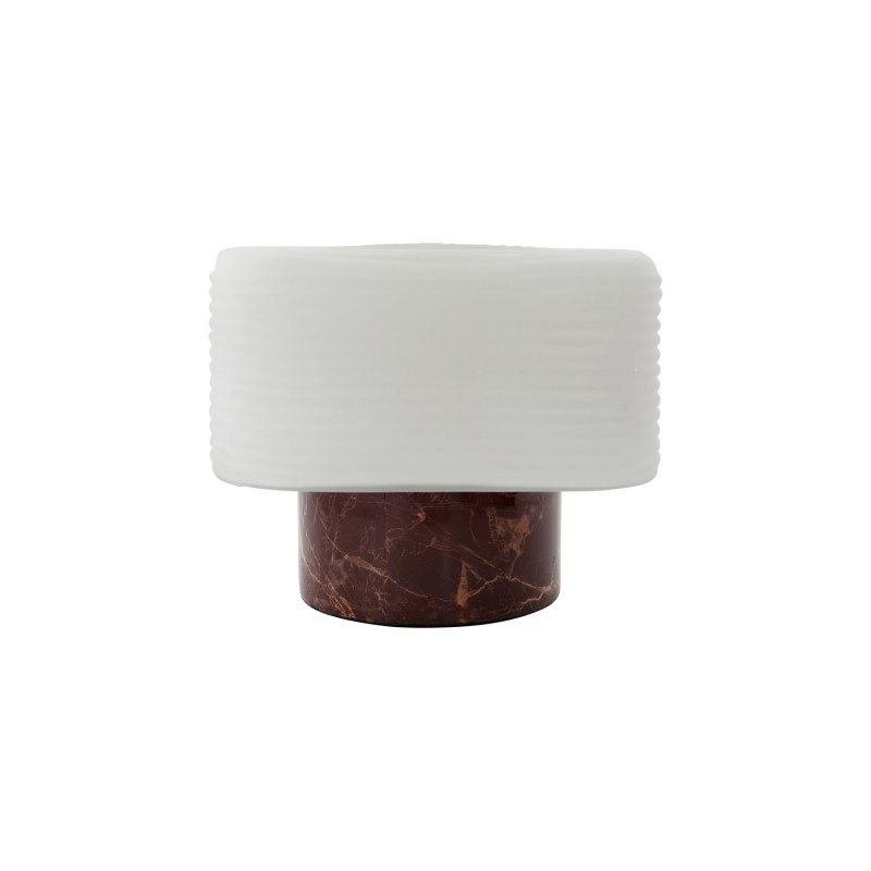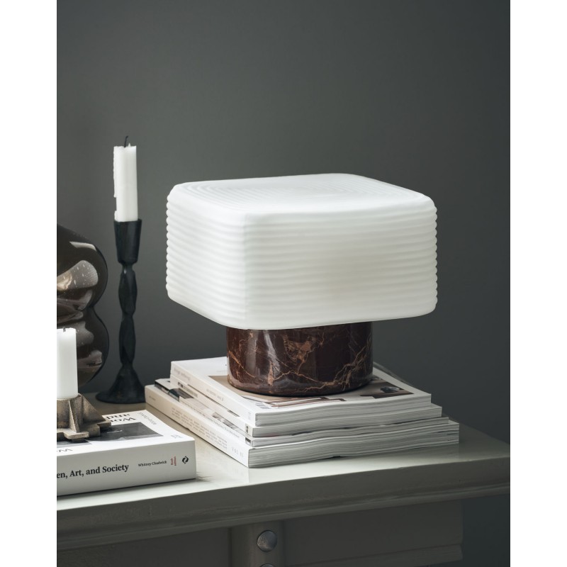 Esthétique sculpturale carrée et un style élégant pour cette lampe de table Neat de House Doctor en marbre brun et verre opalin strié. C’est un design contemporain rempli de contrastes - des formes aux couleurs, en passant par les matériaux et les surfaces.