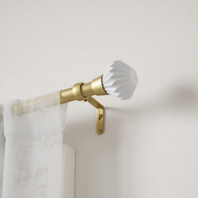 Apportez une touche chic à votre déco avec Pleat d'Umbra, une tringle à rideaux classique et contemporaine, dotée d'embouts rappelant un papier plié façon origami. Pleat est fabriquée avec une finition plus respectueuse de l'environnement, produisant 85 % d'eau en moins que les finitions traditionnelles.
