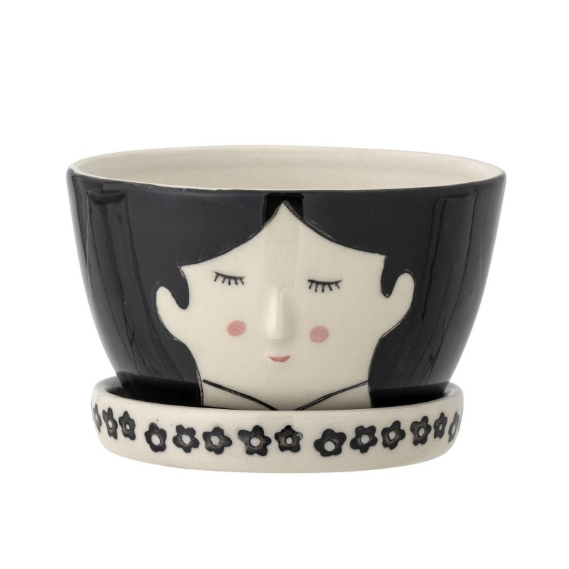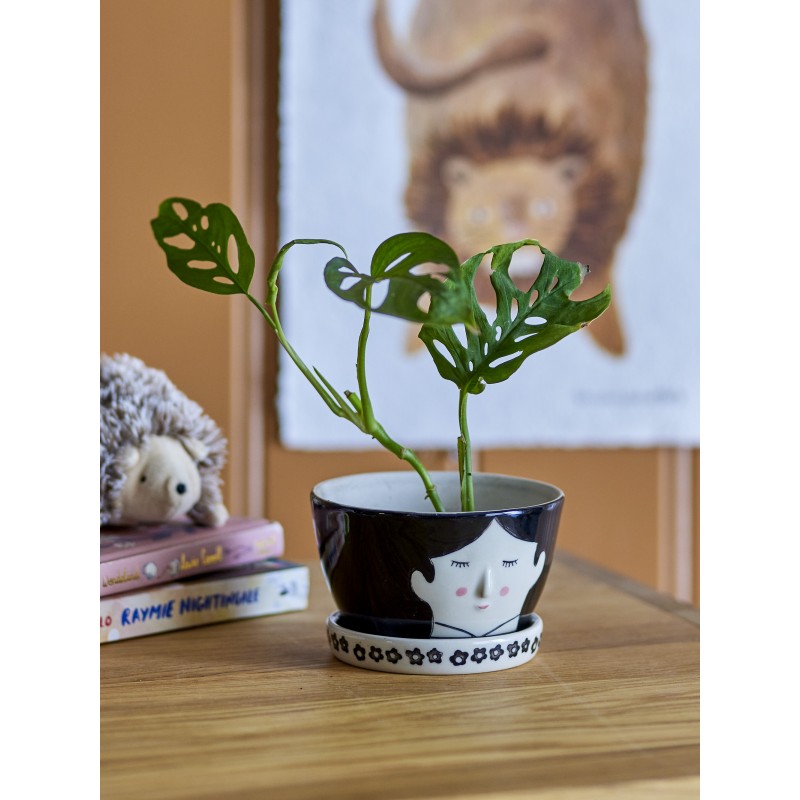 Le cache-pot Carolin avec soucoupe de Bloomingville MINI est peint à la main avec un adorable visage aux cheveux noirs. Utilisez-le sur le rebord de la fenêtre ou sur l'étagère, avec une petite plante verte. Le pot de fleurs étant peint à la main, chaque produit sera unique.