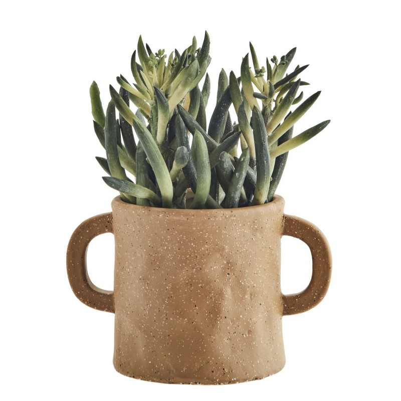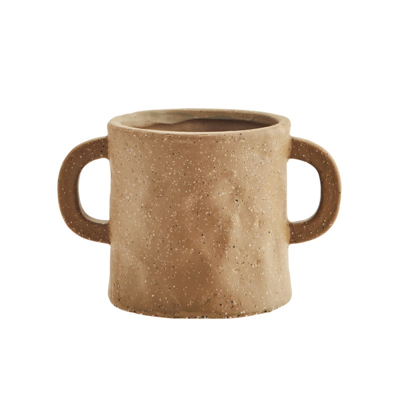 Avec sa couleur terracotta chaleureuse, ses deux anses latérales et sa surface irrégulière, ce cache-pot en grès artisanal incarne à merveille l’authenticité du fait main. Son aspect brut et texturé lui confère un caractère unique, parfait pour une ambiance bohème, rustique ou campagne chic.