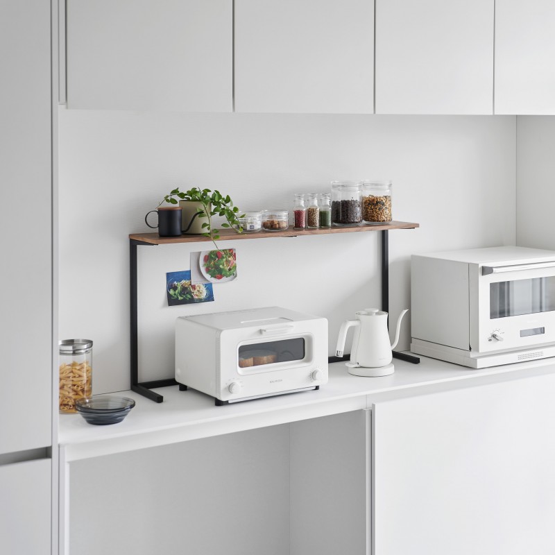 Cette étagère autonome prolonge le plan de travail de la cuisine en offrant un rangement. Sous son plateau en bois, on peut ranger de petits appareils, tandis que l'étagère sert aussi bien aux ustensiles qu'à la décoration.